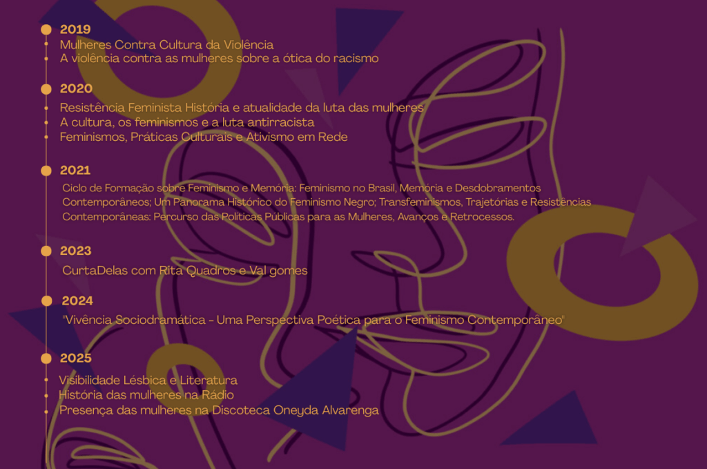 Promovido pela Ação Cultural, “setor que programa atividades voltadas à formação”, o projeto, criado em 2019, propõe-se a refletir coletivamente e agregar informações sobre questões de gênero, sexualidade e cultura em busca de compreender a realidade e tensões que perpassam todas as mulheres – jovens, idosas, indígenas, negras, cisgêneras, transgêneras, travestis, heterossexuais, lésbicas e bissexuais – de maneira transversal e que reconfiguram as relações sociais.