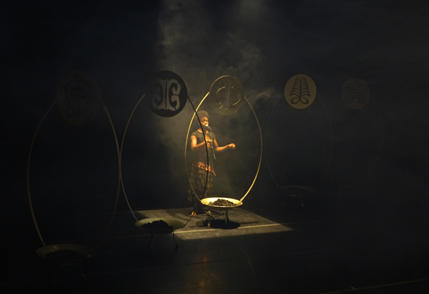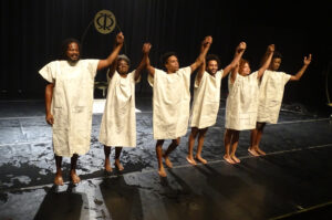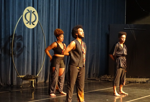 A apresentação seguiu com os dançarinos passando por ‘cachoeira’ montada no palco, e em seguida, numa ode ao belo dos corpos negros, despiram-se, ficando de costas para a plateia, sendo depois cobertos por mantas de algodão cru, com símbolos e palavras escritas em carvão pelo público a cada fim do espetáculo.